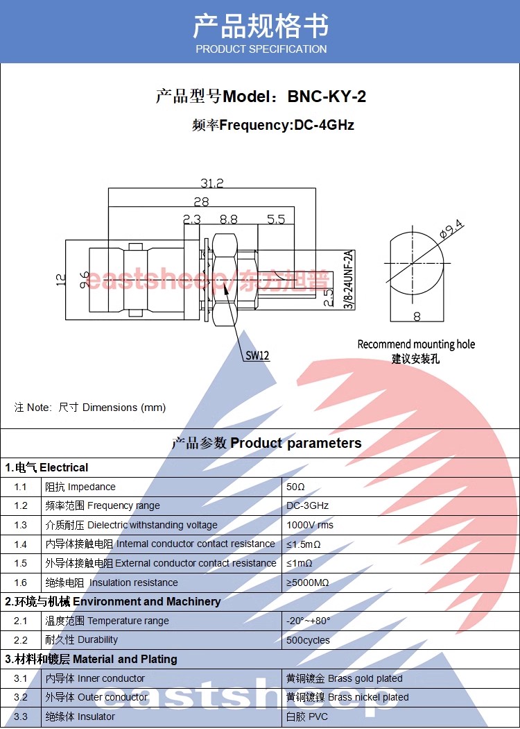 東方旭普 同軸射頻連接器 BNC-KY-1 BNC-KY-2 BNC-50KY母頭機(jī)殼面板固定 帶絕緣螺母固定