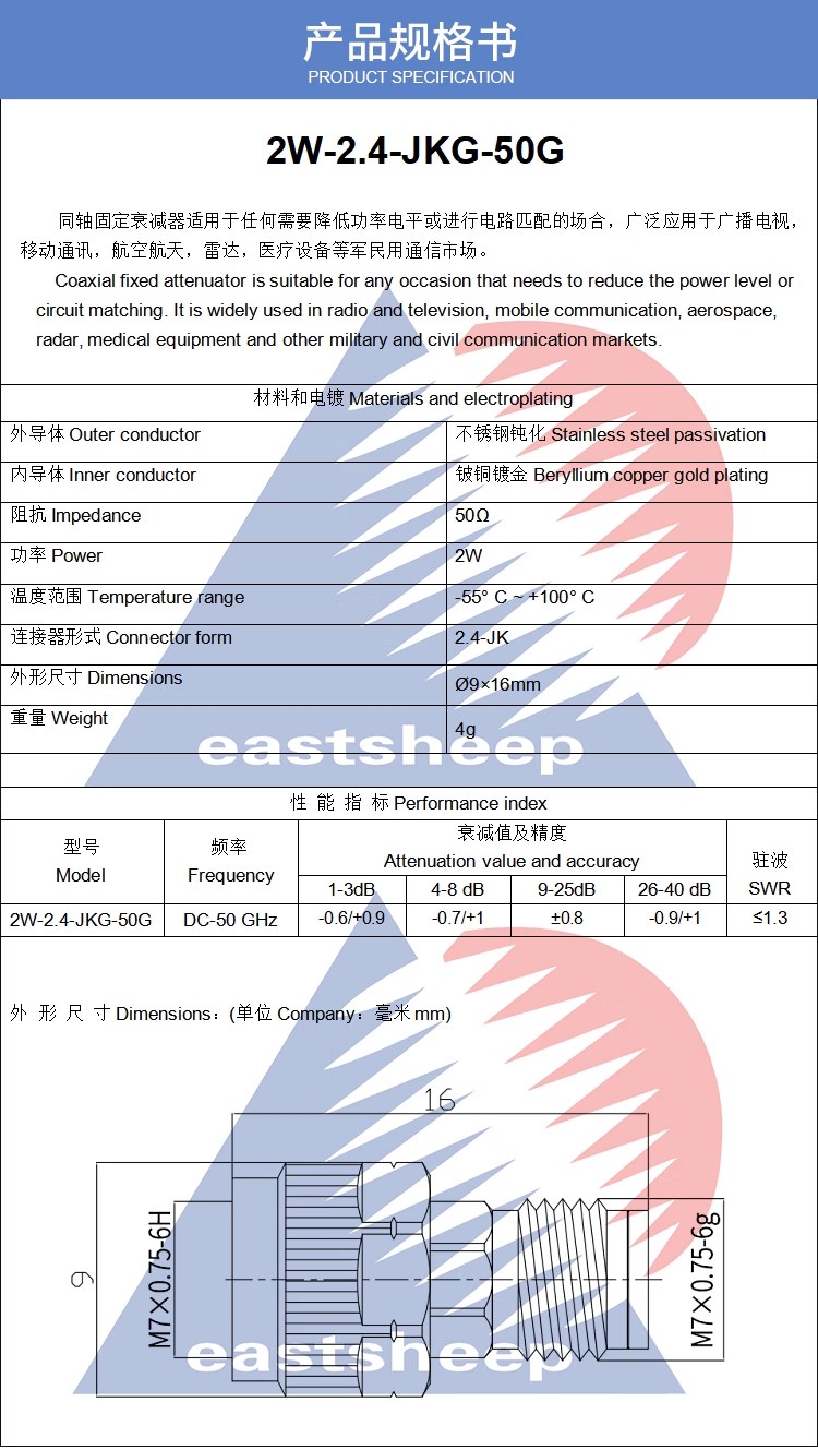 東方旭普 2W衰減器 2.4-JK 2.4mm精密型衰減器10/20/30/40DB 50G