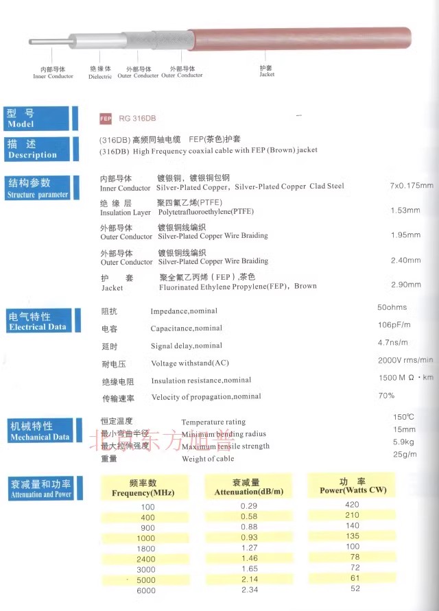 高溫高頻同軸電纜SFF50-1.5-2 RG316DB 特氟龍饋線 雙層屏蔽鍍銀