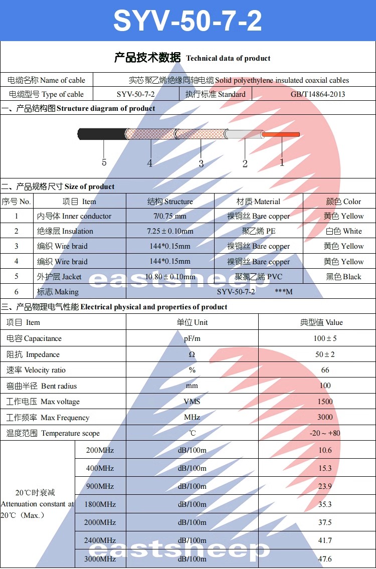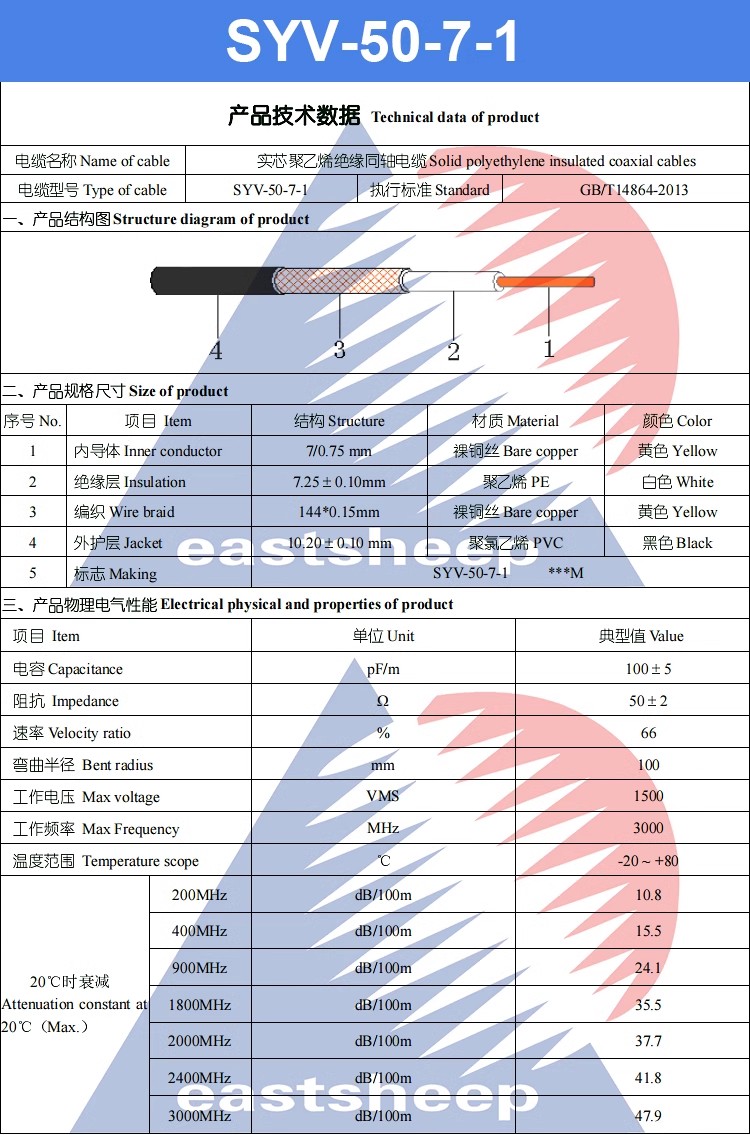 東方旭普 同軸射頻線纜 全銅SYV50-7-1/SYV50-7-2 單/雙層屏蔽